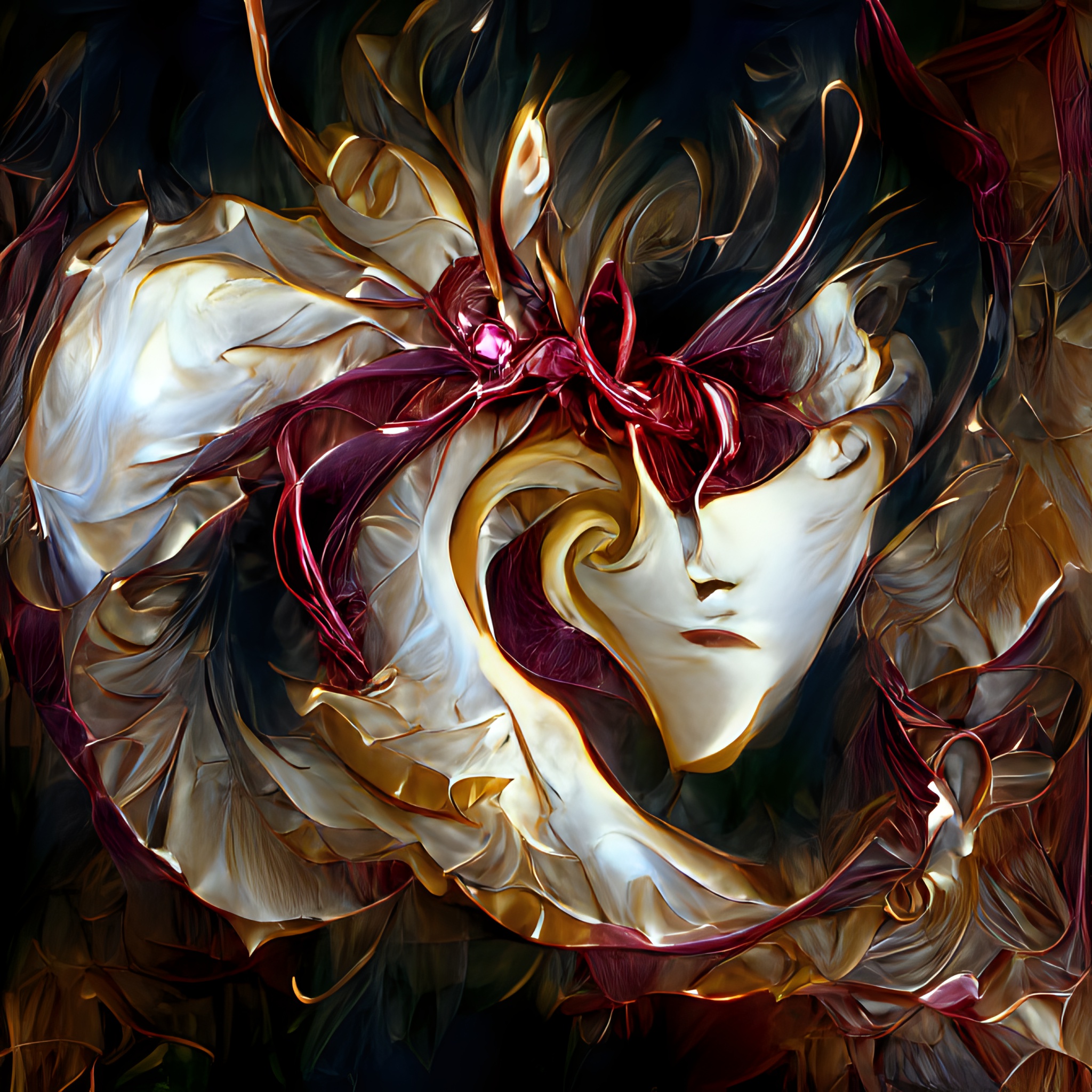 This piece from Botto, a decentralized artist that generates art inspired by the community’s votes, hides a half human half beast within its vibrant coils. The color and texture is decadent and reminiscent of a Venetian mask, ivory, gold, burgundy swirl together with dark shadows of emerald and black. The texture appears to swirl to the center where a mysterious face can be seen, just the bit of an eye, half-closed, a sharp nose, and then a pouting red mouth against an alabaster face. Gold and berry swirls take the place of hair and rise like plumes ruffled by the wind, forming a sumptuous mane. The gold lines mirror the pattern of smoke rising from a candle into the surrounding darkness, creating a mysterious and haunting beauty.