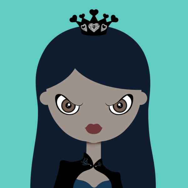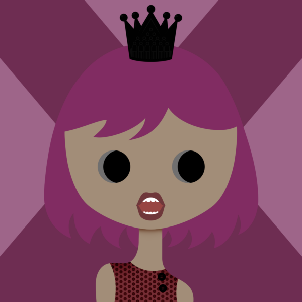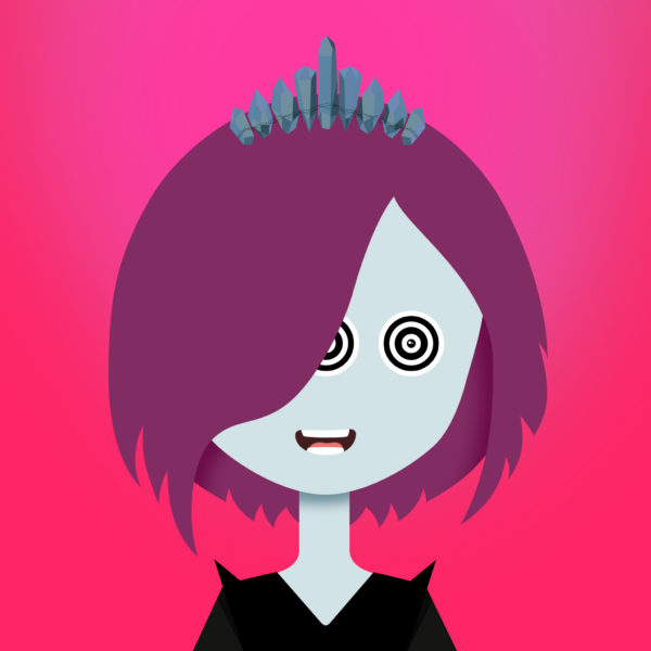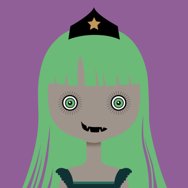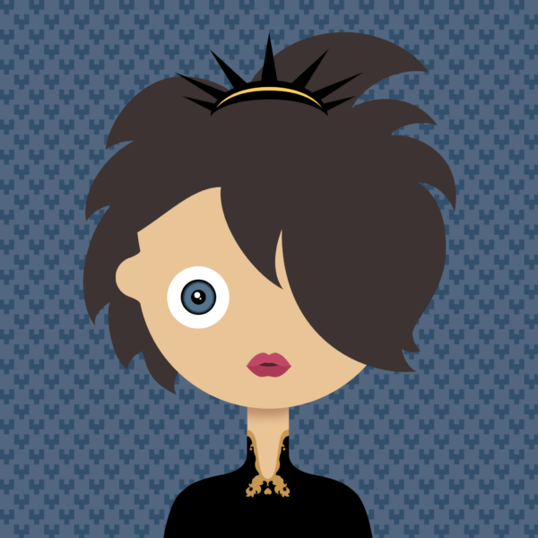 Q+K 3737 features a queen with plum colored hair, black holed eyes, a black crown, and a tell tales mouth that is open in mid-speech. Her dress is burgundy with stable coin dots and in the glam style. In fact, the list of features runs as long one’s arm per category, with eyes ranging from beaming in 3735 where they are wide and sparkling and framed with a sunburst. The varying crowns are eclectic and representative of different kinds of regalities, such as the freedom crown reminiscent of the Statue of Liberty in 3736 paired with a rare regal high-collared black and gold brocade dress. 3732 takes on a wicked fairy tale theme against a turquoise backdrop with evil eyes and black HTao Passion crown with dark hearts. Her glowering eyes and black cape conjure Snow White’s wicked stepmother, suggesting there is a world of story amidst the varied style and features. Collectors are encouraged to amass a great amount of traits so that they can dress and change their kings and queens or use the traits in other capacities. With so many choices and features and styles, an entire kingdom is created in which the artist is the sovereign and has control over the creation and profligeration of the royals that live within it.